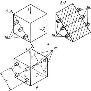 а - схема испытания кубов способом сквозного прозвучивания;