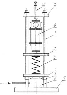 1 - стойки; 2 - верхняя траверса; 3 - средняя траверса; 4 - нижняя траверса; 5 - гайки; 6 - гидравлический домкрат; 7 - постамент; 8 - спиральная пружина; 9 - бетонный образец; 10 - установочный винт.